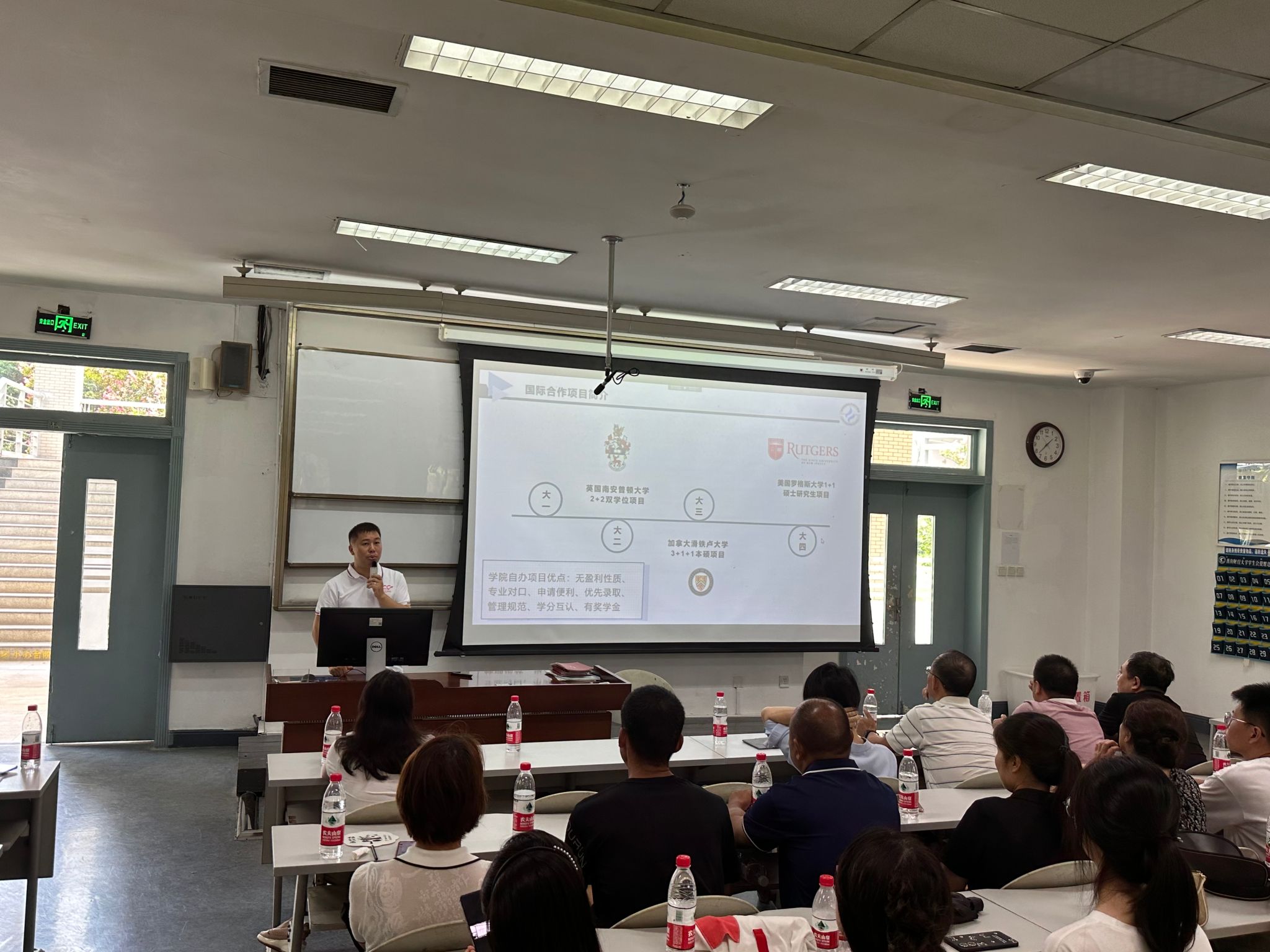 接下来,副院长马丹介绍了学院本科教学与人才培养情况。从人才培养特色、大类招生模式、专业分流及学业问题等方面做了全面阐述。副院长兰伟介绍了学院国际化现状和未来发展方向,重点分享了面向本科生的国际化交流项目及外出交流学生的毕业走向。辅导员朱晨晨从学校日常管理、大学生涯发展、学生身心健康等方面与家长们进行交流。