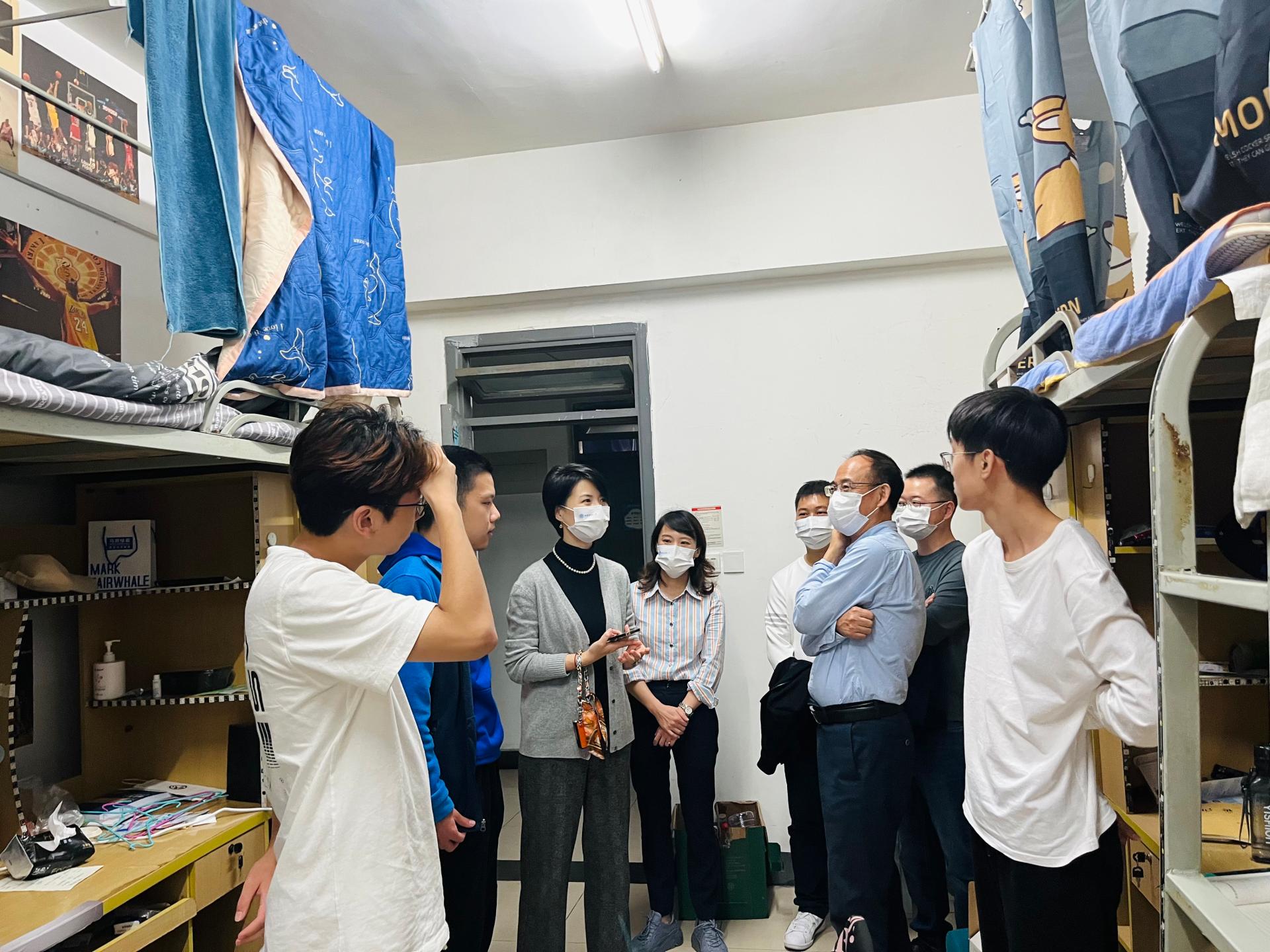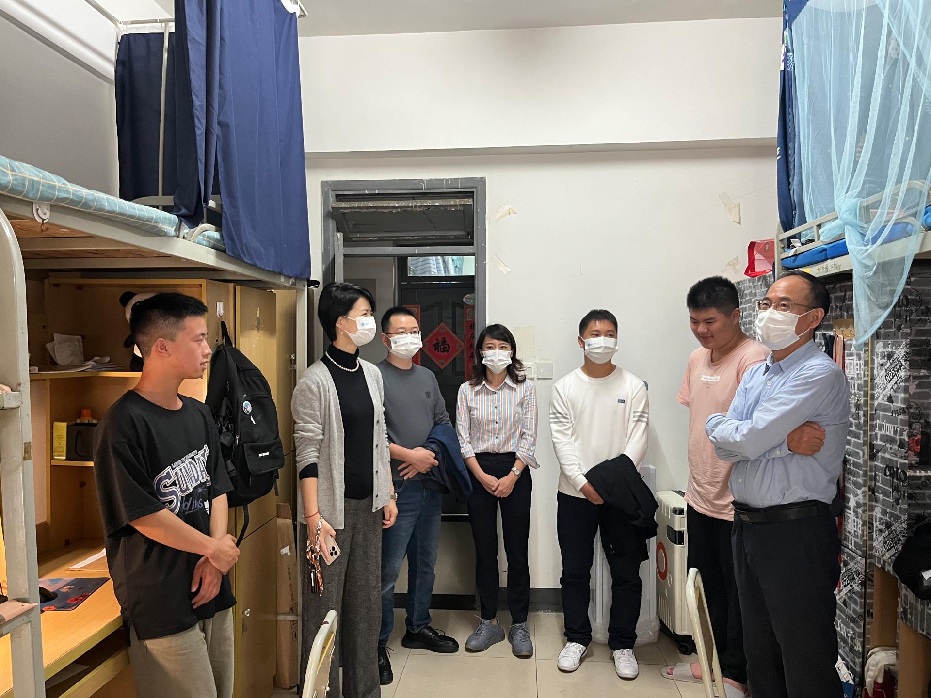 在喜迎党的二十大之际,为深入了解学生思想动态,全力营造热烈良好的氛围,1017日下午,在统计学院党委书记董春、院长郭建军的带领下,学院党委副书记邹先云、副院长马丹、副院长兰伟、辅导员甘筑夏、游孟桥一起走访了统计学院柳林校区学生寝室,关心慰问学生在校期间的学习生活情况。
