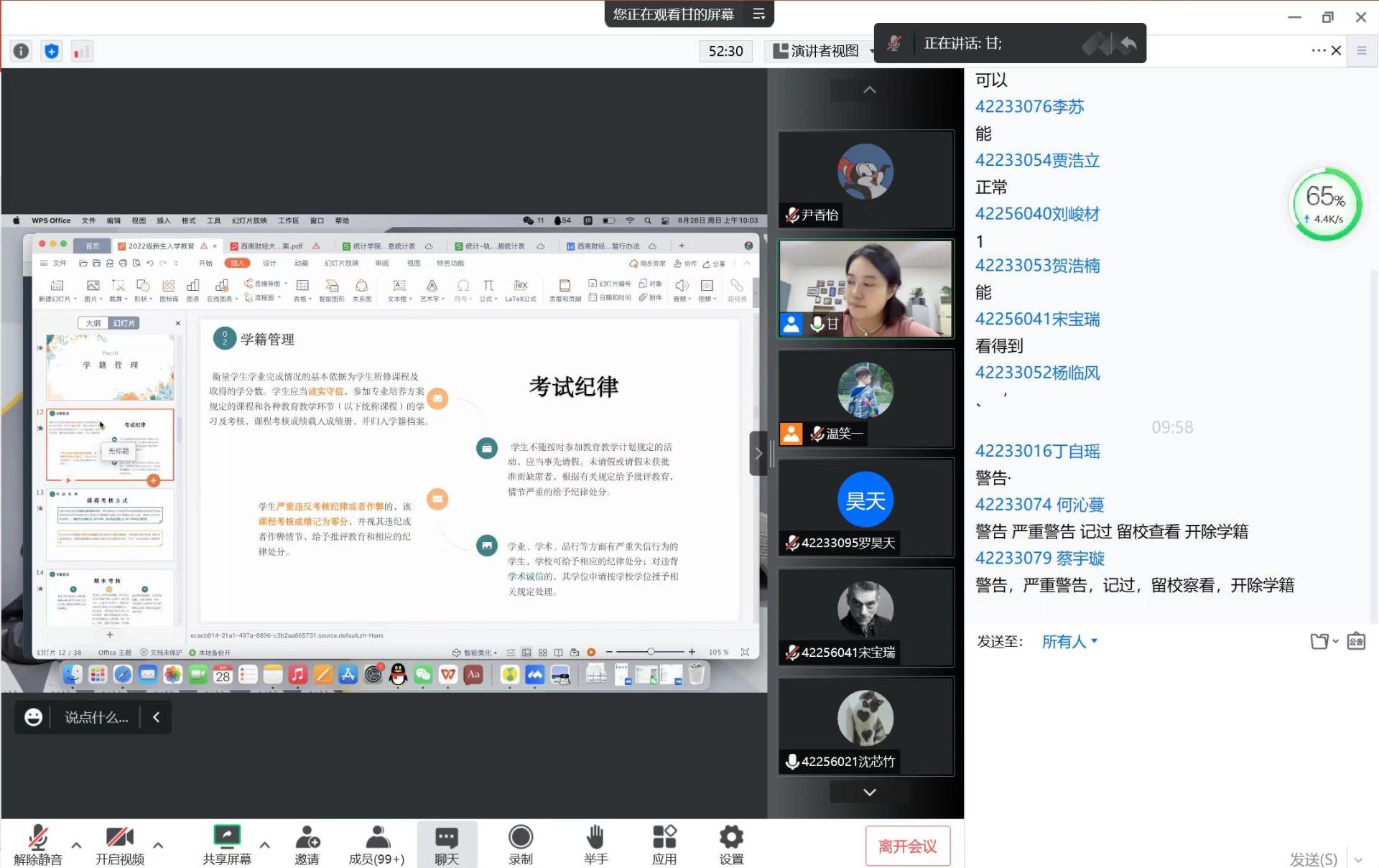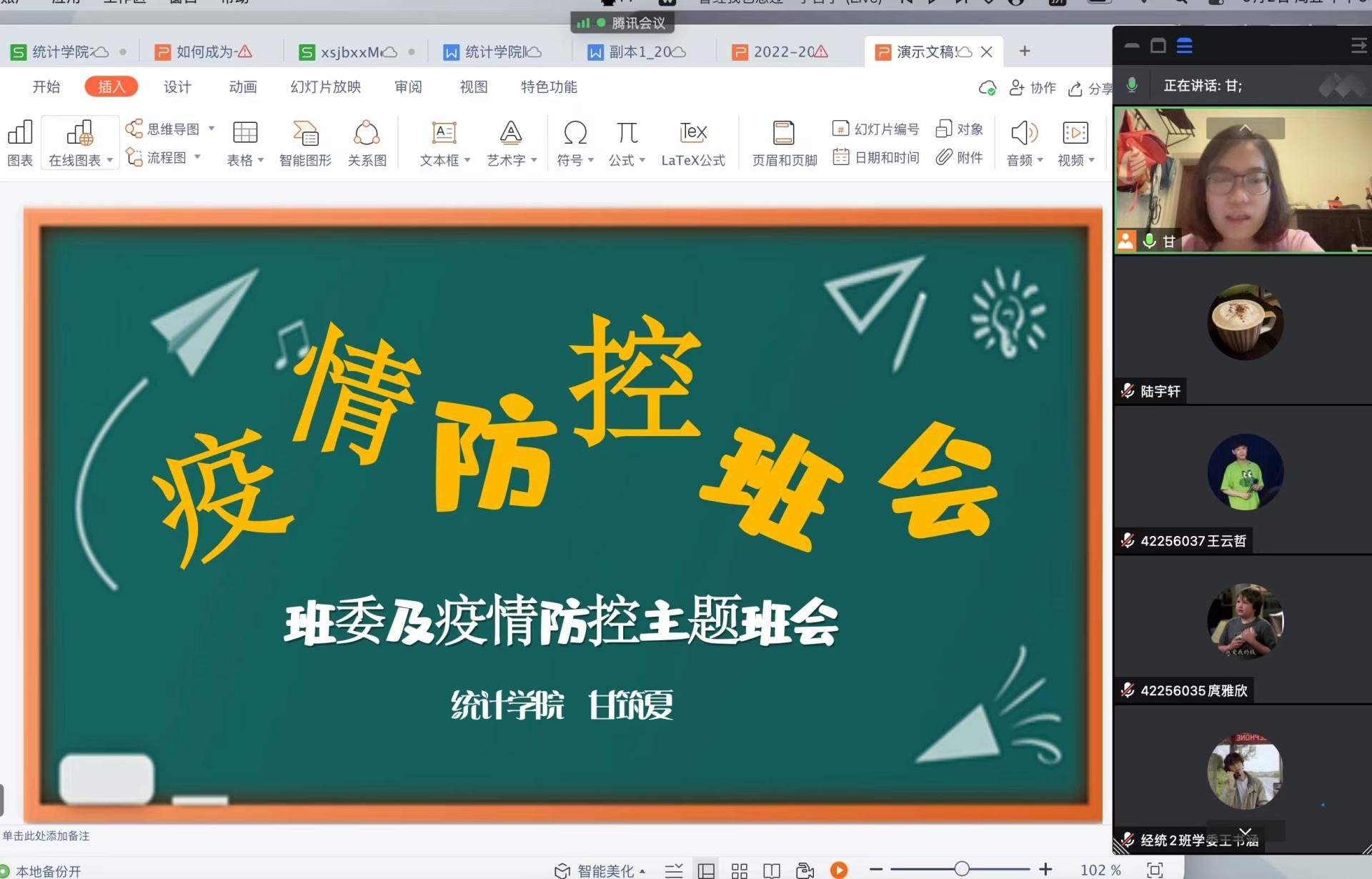 8月27日-8月28日期间,统计学院分层次、分专题展开了6次主题教育。分别从“云见面”“专业介绍”“学习《学生手册》”、“疫情防控政策解读”、“安全教育”“入党流程”等几大主题为切入点,详细为新生同学解读了培养方案的内容,回答了同学们关于选课的疑惑;本科生辅导员和新生分享了“大学生的使命与担当”“我和我的大学生活”“时间规划”等内容,更好地引导本科新生转变角色、尽早适应大学的学习和生活;研究生辅导员则和新生分享了科研学习、职业规划、就业情况等内容,帮助研究生新生更好地做好科研计划、学业规划;同时认真开展并共同学习了《学生手册》《新型冠状病毒肺炎诊疗方案(试行第九版)》《高等学校新冠肺炎疫情防控技术方案(第六版)》等相关政策和文件。本次系列主题教育内容充实、组织精心,为帮助新入学同学更好更快适应新学习、新生活奠定了良好基础。