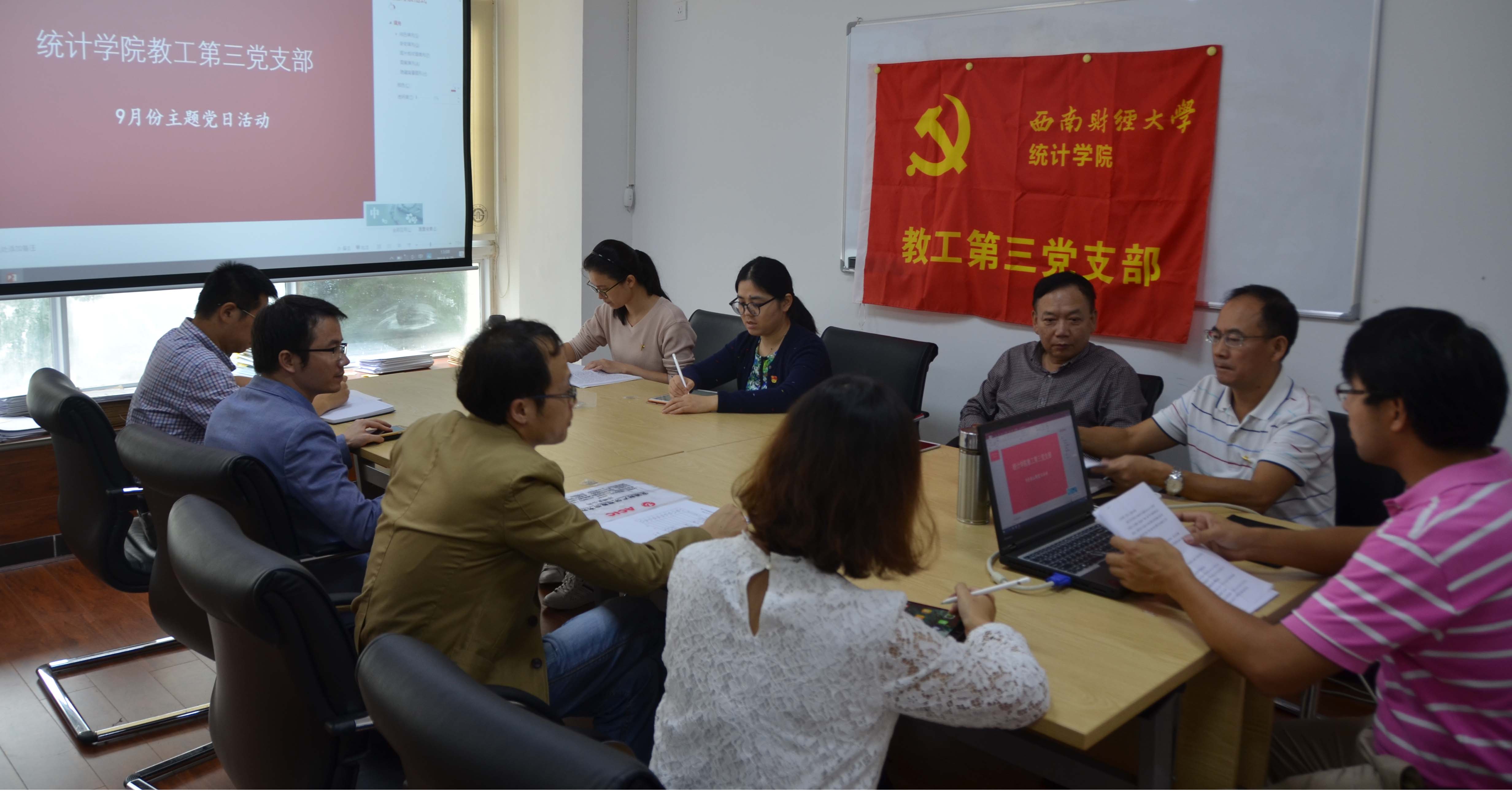 为深入学习贯彻习近平新时代中国特色社会主义思想和党的十九大精神,深入推进“两学一做”学习教育常态化制度化,按照《关于全面推行支部主题党日的实施办法》的要求,统计学院教工第三党支部于9月25日下午开展了“切实提高政治站位,着力强化责任担当,奋力开创新时代学校事业发展新局面”为主题的党日活动。