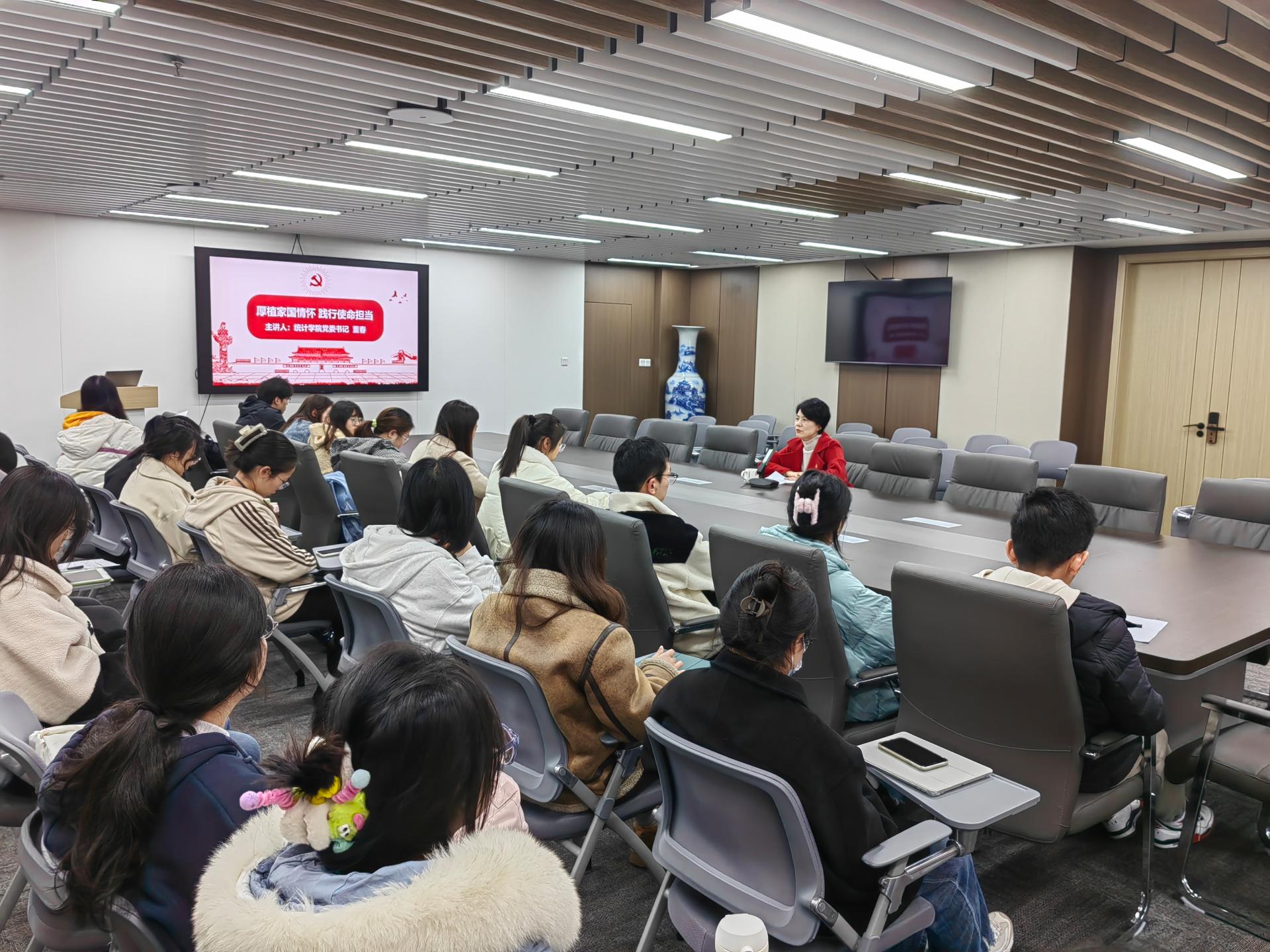 2023年12月12日下午3点,统计学院党委书记董春在诚正楼13楼会议室以主题“厚植家国情怀,践行使命担当”为学院研究生上思政课。