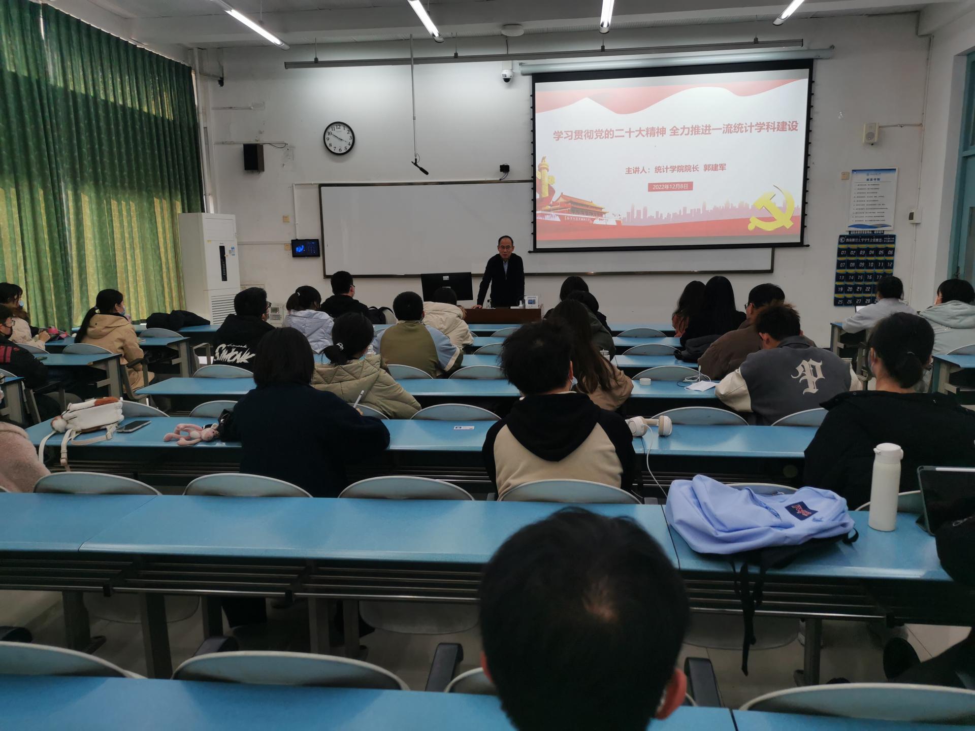 为深入学习贯彻党的二十大精神,2022年12月8日下午,统计学院院长郭建军以《学习贯彻党的二十大精神 全力推进一流统计学科建设》为主题给统计学院部分研究生讲思政课。