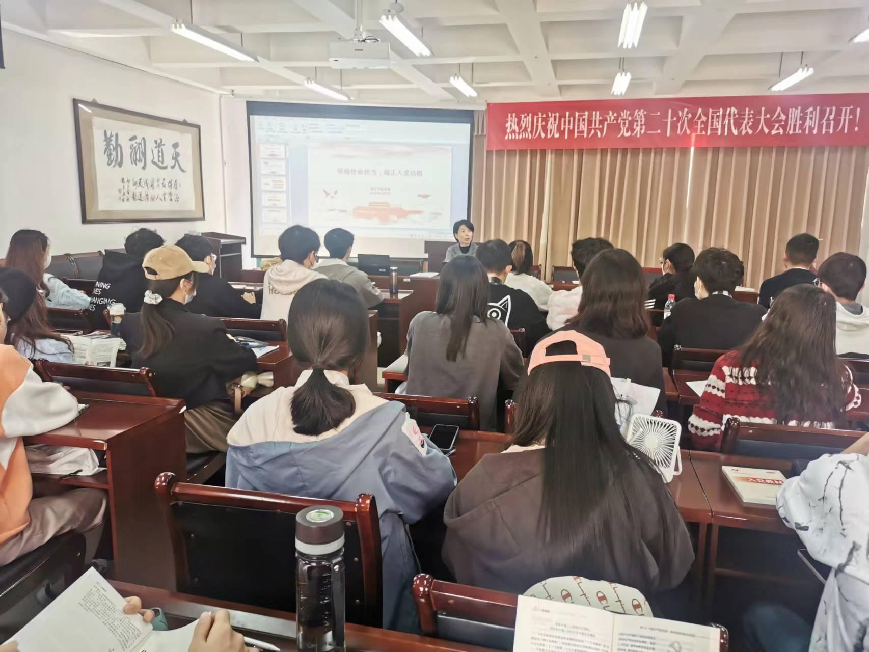 董春以“明确使命担当,端正入党动机”为主题,向学员们讲授了本期第一堂党课。她分别从党的光辉历程、党的性质和根本宗旨、端正入党动机以及以实际行动争取早日入党等五个方面进行了讲授。她特别强调,中国共产党第二十次全国代表大会刚刚胜利召开,各位学员要对党的二十大精神进行全面深入的学习,对新修订的《中国共产党章程》进行研读,不断提升自身对党的认识,不断端正入党动机。
