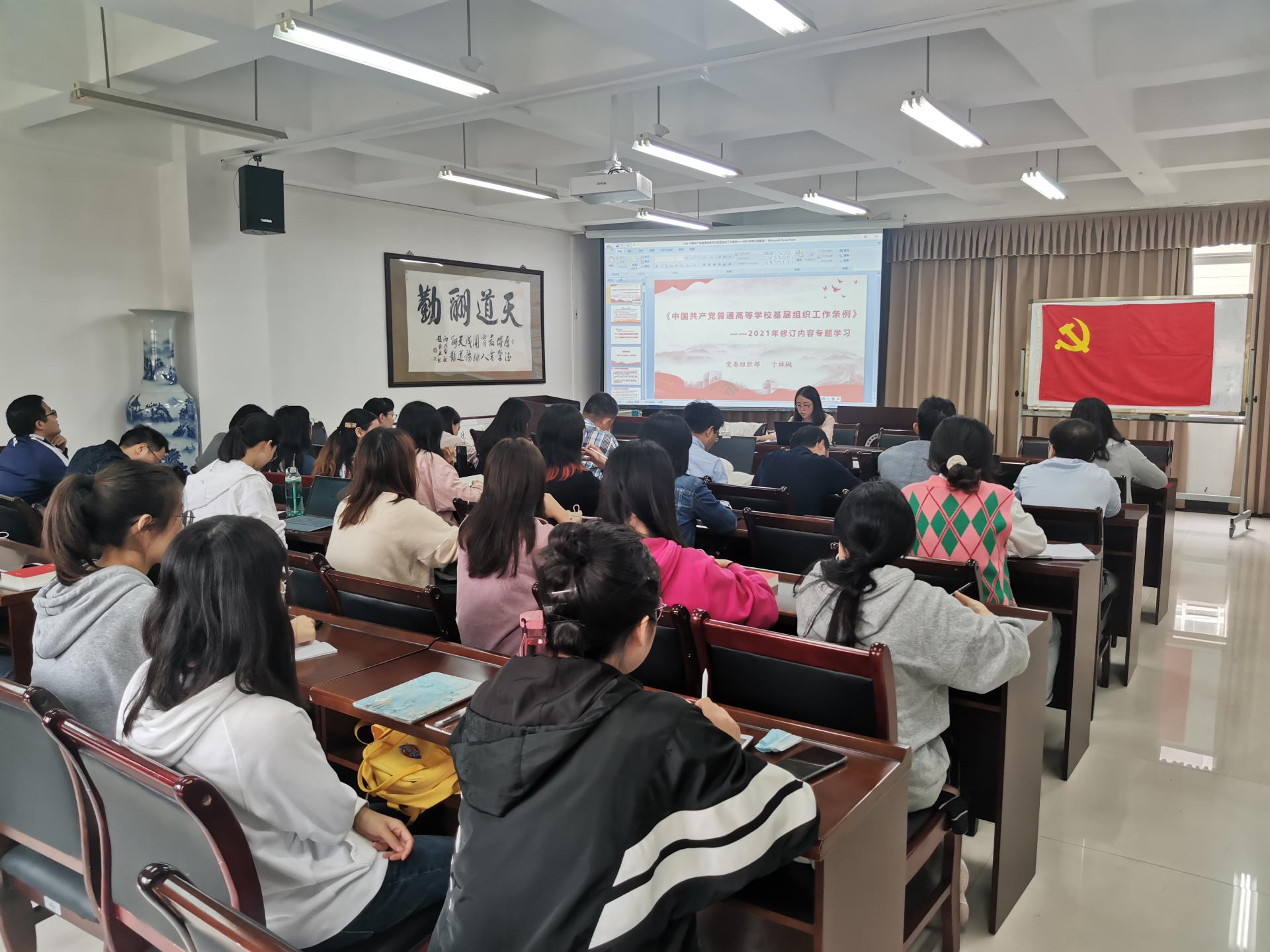 2021年10月9日,统计学院全体支委在通博楼B212会议室开展了党支部支委党务工作能力培训,本次培训由党委组织部于林樾为全体支委解读《中国共产党普通高等学校基层组织工作条例》——2021年修订版。