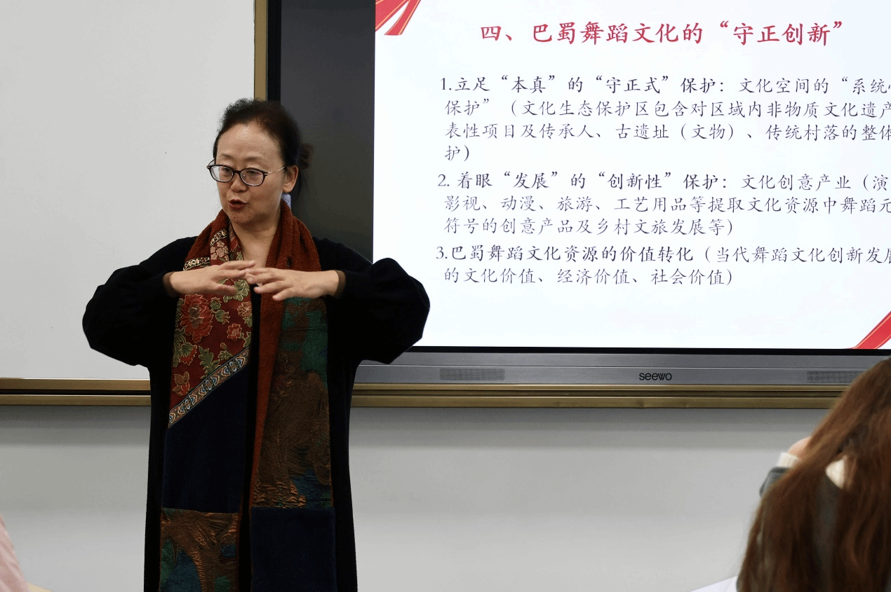 讲座从巴蜀文化的古今流变讲起,追溯巴蜀舞蹈的起源,探讨其在不同历史时期的发展演变以及其在文化交流中的独特作用。接着深入探讨了巴蜀舞蹈在当代社会的传承方式与发展路径,阐述巴蜀舞蹈在传承与发展中华优秀传统文化中的重要作用。最后通过经典作品赏析,解读了巴蜀舞蹈的独特风格、动作特点与表现手法,展示巴蜀舞蹈的艺术魅力与审美价值。