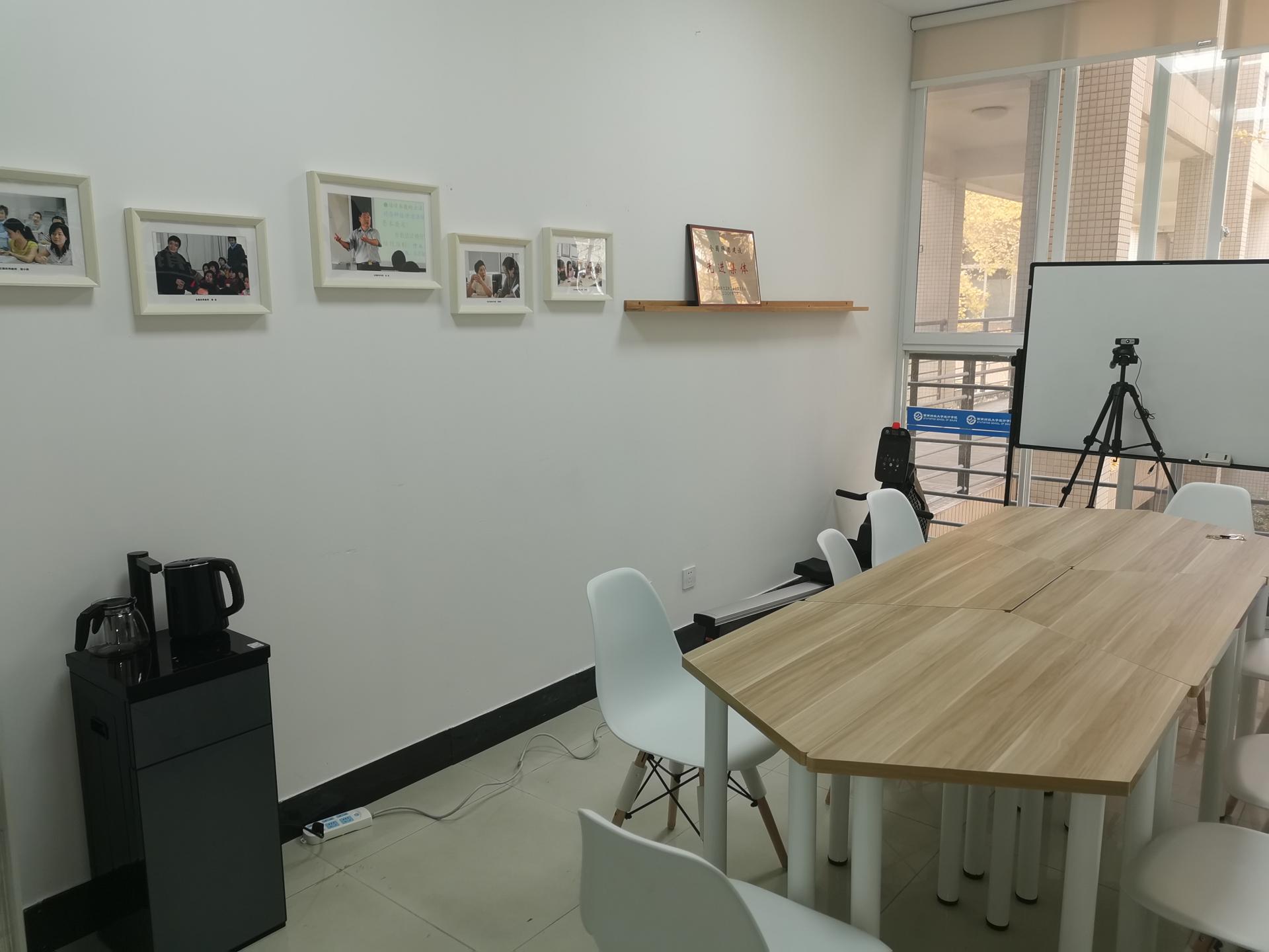 活动室内配备有可移动桌椅、白板、饮水机等,可用于学生朋辈辅导、师生交流互动等活动;配备无线网络及移动视频设备,可用于学生远程网络面试等活动;配备智能电视,可满足小型线上会议和讨论活动等需要。