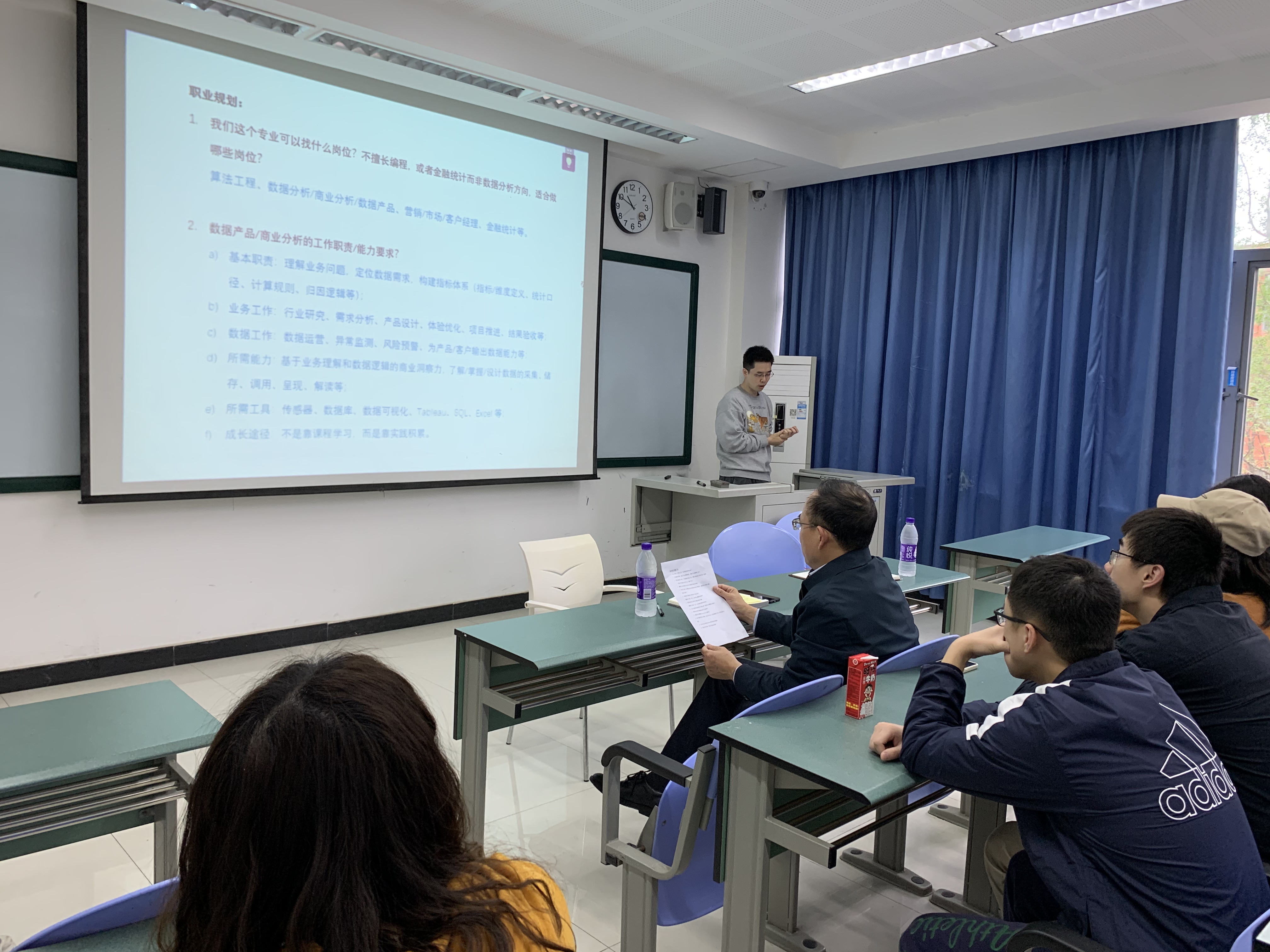 在提问环节,针对同学们提出的行业实习与专业学习的重点偏向、数据分析师专业技能掌握程度、如何通过参加学科竞赛丰富自己的个人简历、银行信息科技岗的工作职责、秋招面试的应对准备等问题,学院领导和老师结合自身学习科研经历和行业兼职经验进行了详细的解答,强调同学们应制定符合自身实际的专属培养方案,通过学院的专业实践基地、联合培养项目提升就业竞争力,期望大家珍惜在学校的学习、实践机会,通过多重渠道认识世界、积累经验和认知自己,在不断的尝试中实现对自身的迭代、更新、优化。