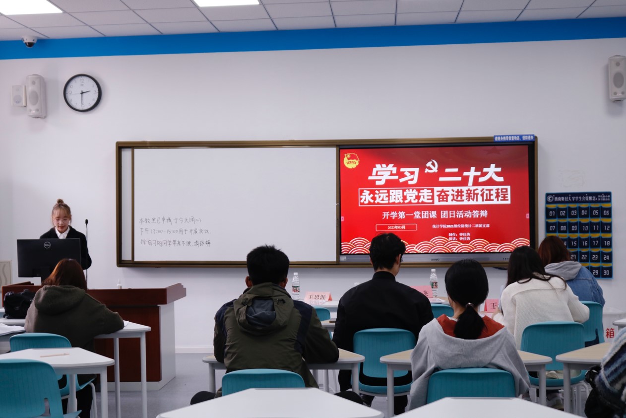 2023年4月4日开展2022-2023学年第二学期“学习二十大、永远跟党走、奋进新征程”团日活动院级答辩,会场设置在经世楼,参会人员有统计学院分团委书记王英老师和副书记王思涯老师、赵泠萱,研究生学生会文体部部长王宇雪和院团学组织部副部长朱昱嘉。