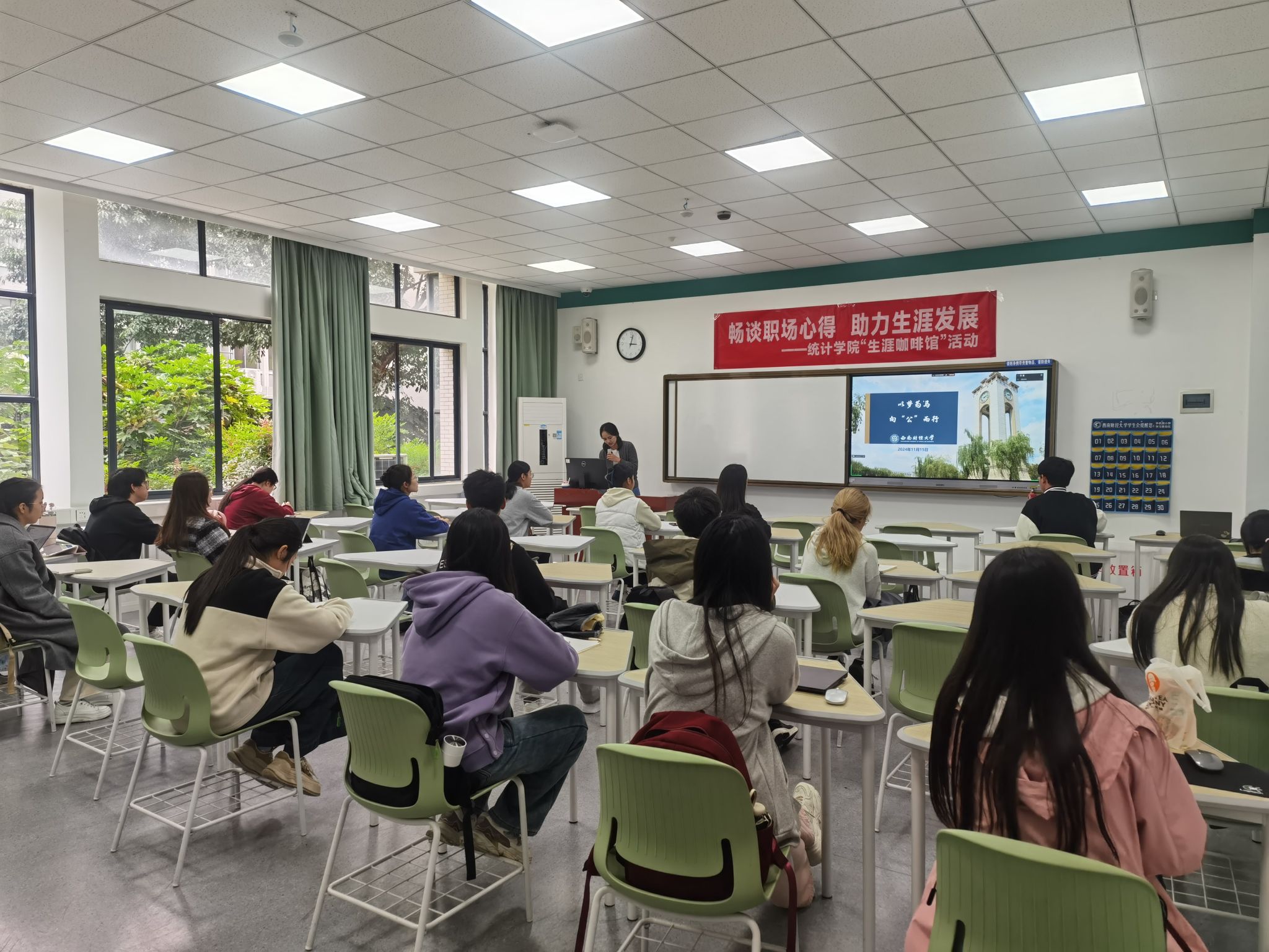 为增进校友联络,营造百年校庆氛围,11月15日,统计学院“生涯咖啡馆”活动在柳林校区经世楼B106教室成功举办。本次活动特别邀请了本科2012级校友、现就职于某省直机关并具有多年公务员工作经历的骆宣亦,为在场同学带来了一场精彩的职场心得与工作感悟的分享。