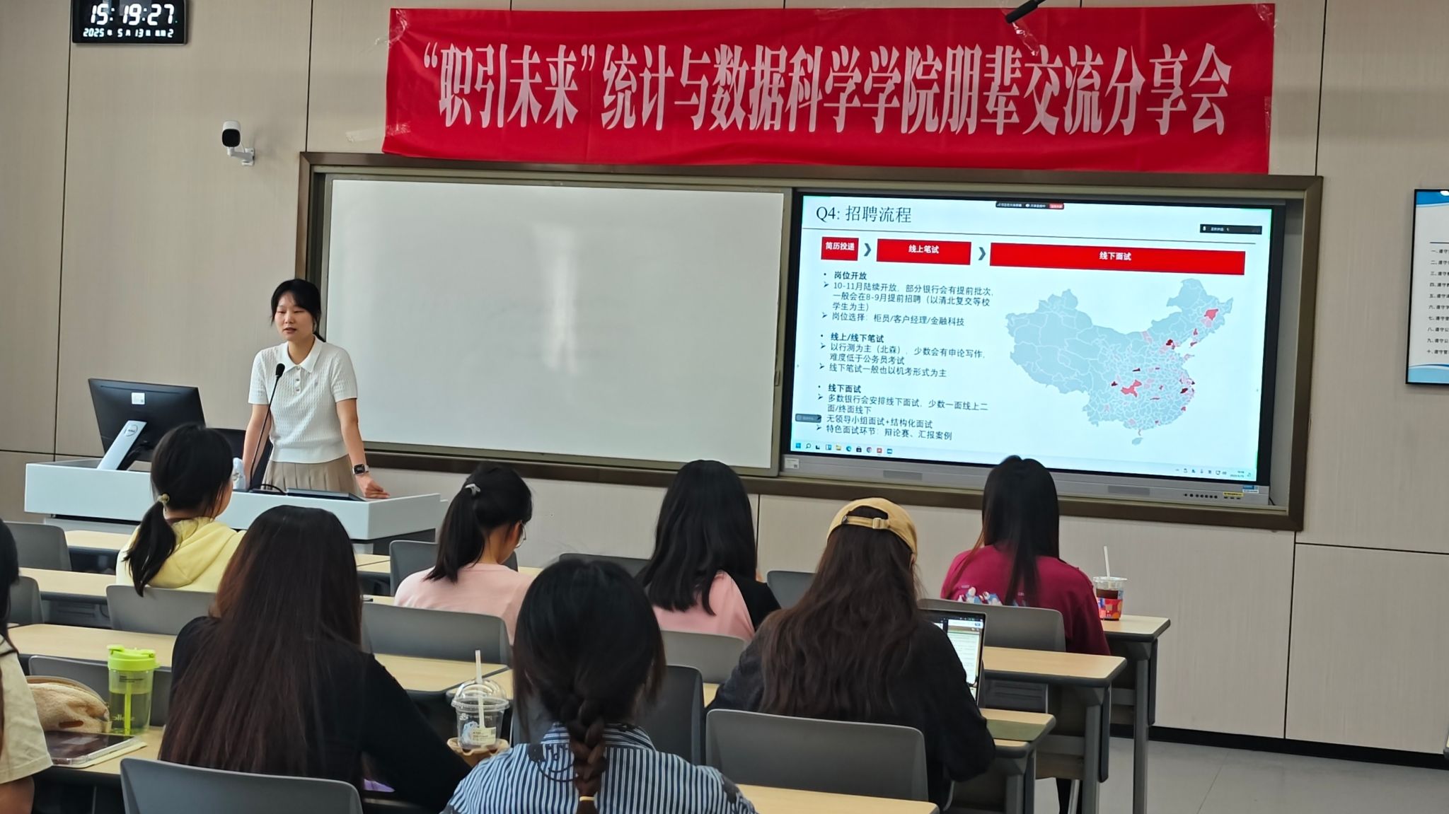 于经世楼C208举办“职引未来”朋辈经验交流会金融行业就业专场。本次活动邀请到两位在金融机构实习或签约的统计学子,解析金融领域求职策略,为到场同学指点迷津。