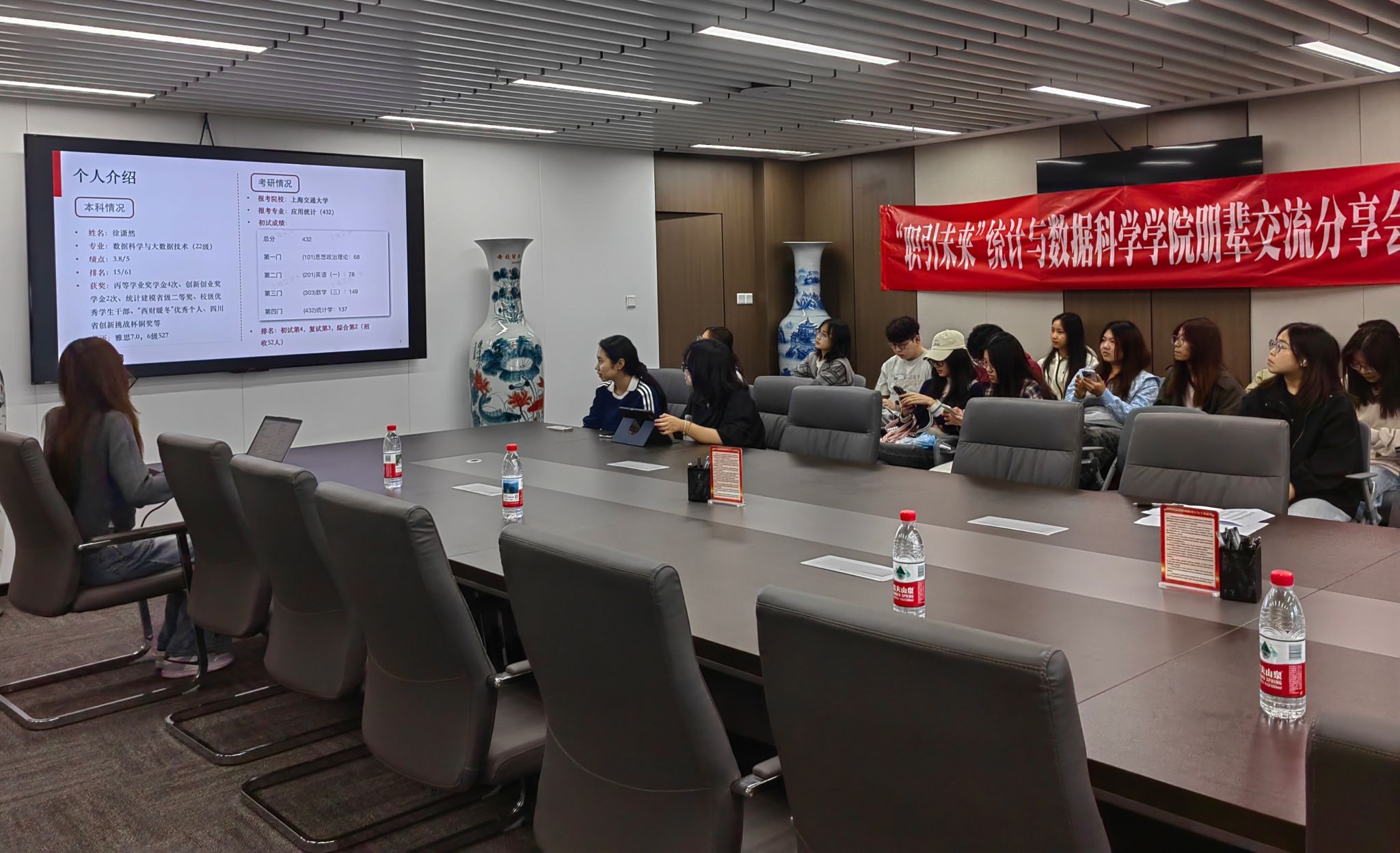 2022级数据科学与大数据技术专业徐潇然,现已成功上岸上海交通大学应用统计专业。她重点分享了考研择校方法与信息搜集渠道,提醒大家综合考量地域、分数线等关键因素。同时,她结合备考经验理性分析了报班的必要性,鼓励同学们调整心态、排除焦虑,以良好状态投入复习。